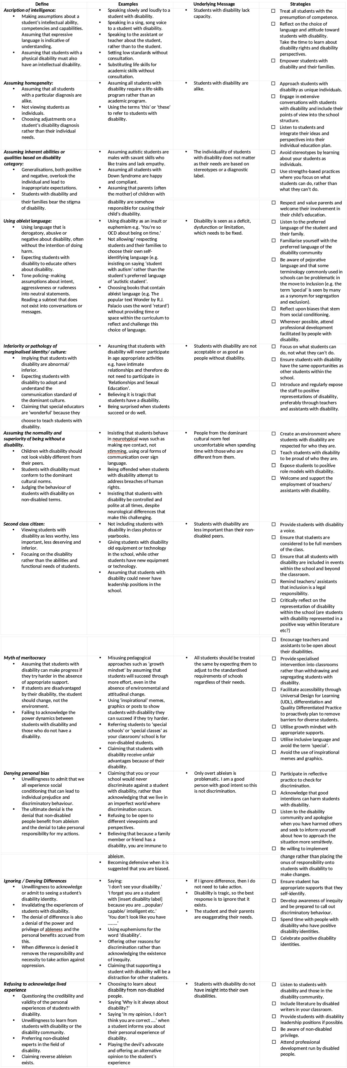 The table below on micro-aggressions can assist educators to develop a teaching/ learning plan to address this issue and ensure that the school is inclusive for all students, including students with disability. This table reduces an extremely complex issue to a simplistic one, but it is starting point. The table contains terms utilised within disability studies that readers may not be familiar with including: